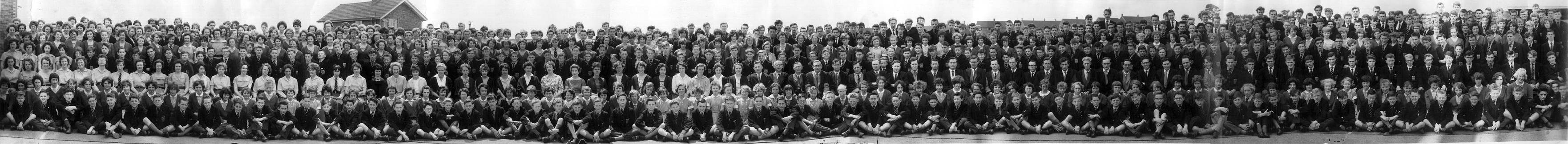 I was in 4L at the time. I’ve been studying the picture again (in fact I still have a print of the original) and can identify about 100 of the pupils so far (mostly in the fourth form). Details will find there way to you in the near future. Its a bit difficult identifying positions at the back because I recall everybody falling over themselves to get into the picture and we were trying to stand on only half the number of chairs that there were pupils. It was windy at the time and the photographer had trouble setting his exposure because of the sun going in and out. A good stunt though – and now a challenging test of long term memory.